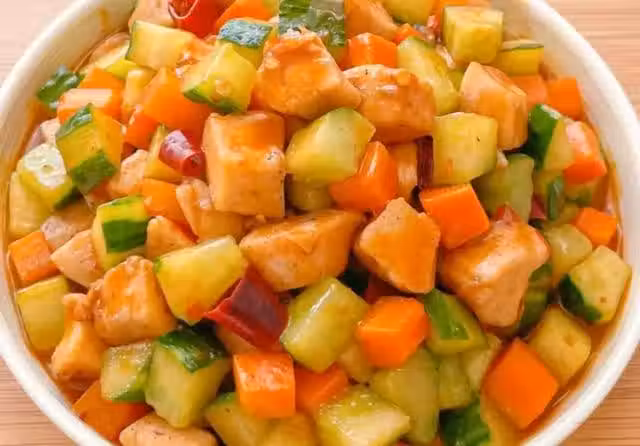 (4)下入胡蘿蔔翻炒變軟,再倒入雞肉丁和黃瓜,加入適量的醬油、蚝油、陳醋、澱粉、白砂糖調味。