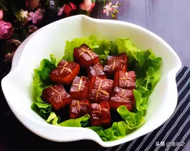 10、用干茅草或蒸幾秒鐘的細蔥葉、韭菜把每塊東坡肉紮起來裝飾一下,讓肉肉擺盤看起來更漂亮些。