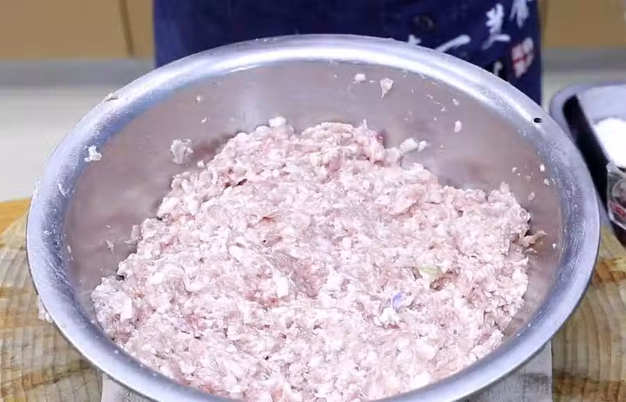盆中加入適量的食鹽、白糖、味精、雞粉、胡椒粉、十三香、生抽、老抽順著一個方向攪拌均勻,這個時候放入芹菜碎繼續拌勻,無論調什麼餡都要先打好肉餡再放配菜,這樣既不容易出水還能更好的融合。