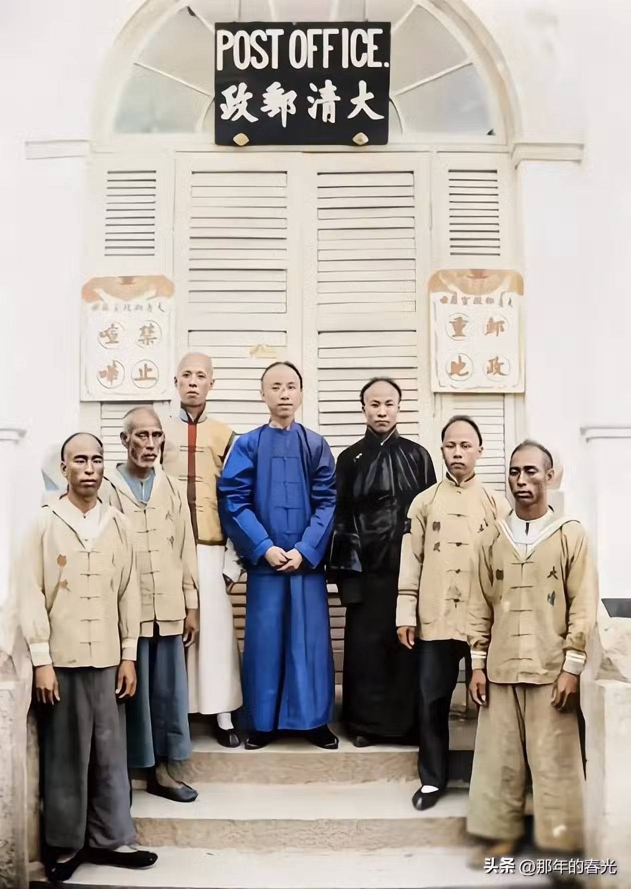 晚清政府在當時參照西方的模式成立了「大清郵政」,照片中是一處剛剛掛牌成立的辦事處,所有的工作人員集體拍下了這樣的一張合照。