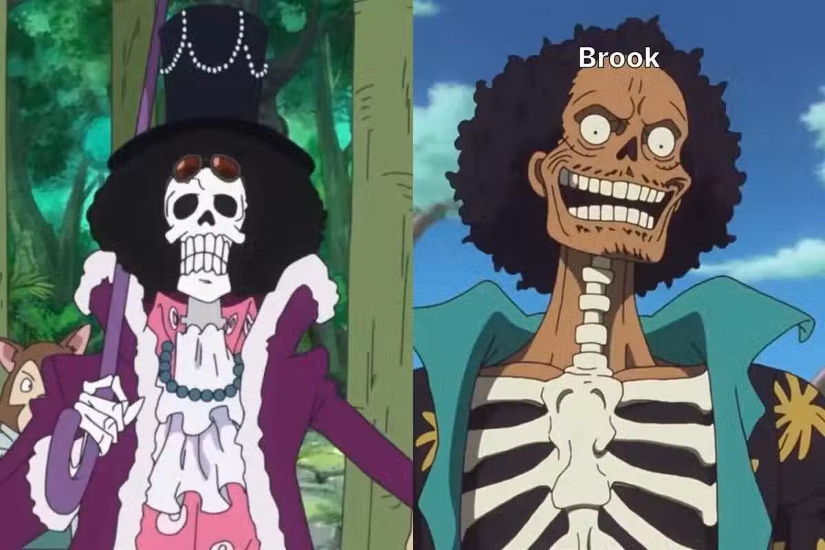 吉卜力風格的布魯克有乾巴褐色皮膚,骨頭露出,宛如活了千年的老教授。他的眼神充滿智慧與靈性,身上散發著神秘的氣息,是船上的智囊和靈魂。