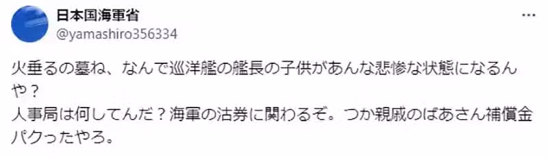 這位暱稱「日本國海軍省」的日本X網友,最近發文吐槽起《螢火蟲之墓》的清太和節子兄妹,有著在海軍當大官的爸爸這座靠山,根本不可能會落得如此悲慘的下場!