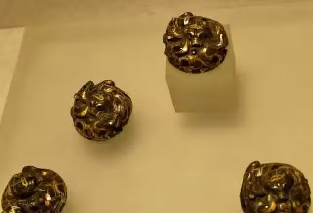 「虎噬熊錯金銀銅鎮」共4隻,高3.1厘米,地徑4.6厘米,鎮身由一隻「虎」和一隻「熊」交迭糾纏組成;虎的雙爪緊緊抓住熊身,虎口還在用力撕咬,而那隻「熊」則仰頭哀嚎,一條腿似乎還在做垂死掙扎。這幅「虎噬熊」倒也符合劉非「好力氣」的性格,但「銅鎮」的華美卻主要體現在獸身布滿錯金銀的雲氣紋,更有甚者,每件「銅鎮」上還鑲嵌著約50顆紅黃綠三色寶石;這些寶石為瑪瑙、玉石和綠松石,尤其是「虎熊雙獸」的眼睛均以紅色寶石鑲嵌而成,其製作之精美可謂巧奪天工,雙獸造型被刻畫的入木三分,頗有今天的「寫實」塑造特點。