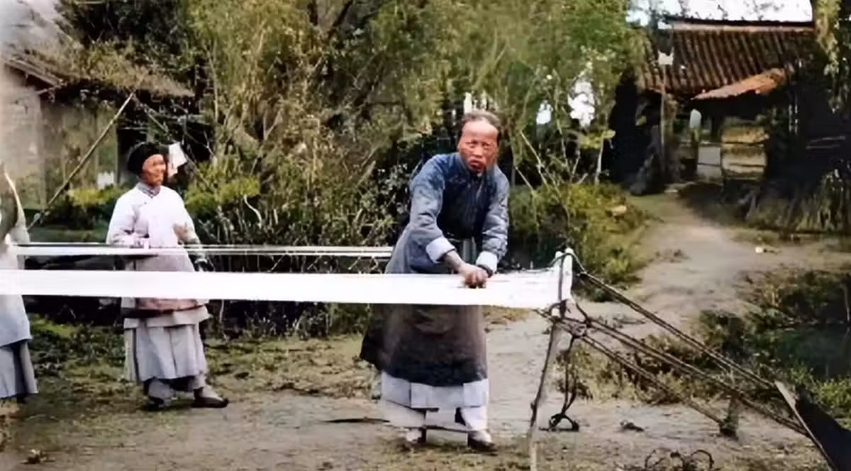 這應該是農村一個大戶人家,找人在織布,家裡原來也有台織布機,多少年前讓我劈柴燒了。