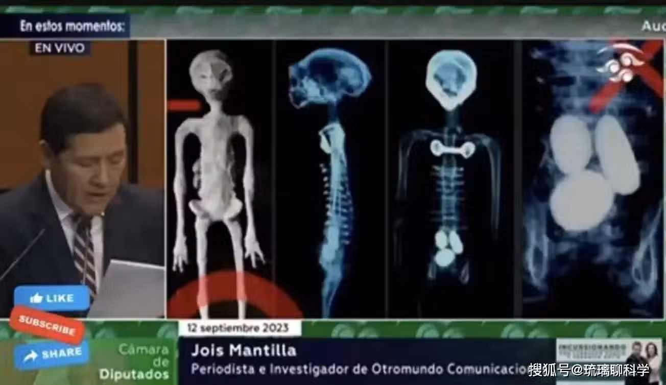 去年9月,墨西哥國會召開的一場聽證會更是將這一話題推向了新的高潮。會上,展示了2017年在秘魯庫斯科硅藻礦中發現的兩具所謂「外星人屍體」,並公布了這兩具屍體的X光照片,清晰地展現了其身體結構。令人驚訝的是,其中一具屍體內竟還被發現含有「三個蛋狀物體」!這一消息的公布立即引起了軒然大波,時至今日,這一事件依然被廣泛討論。