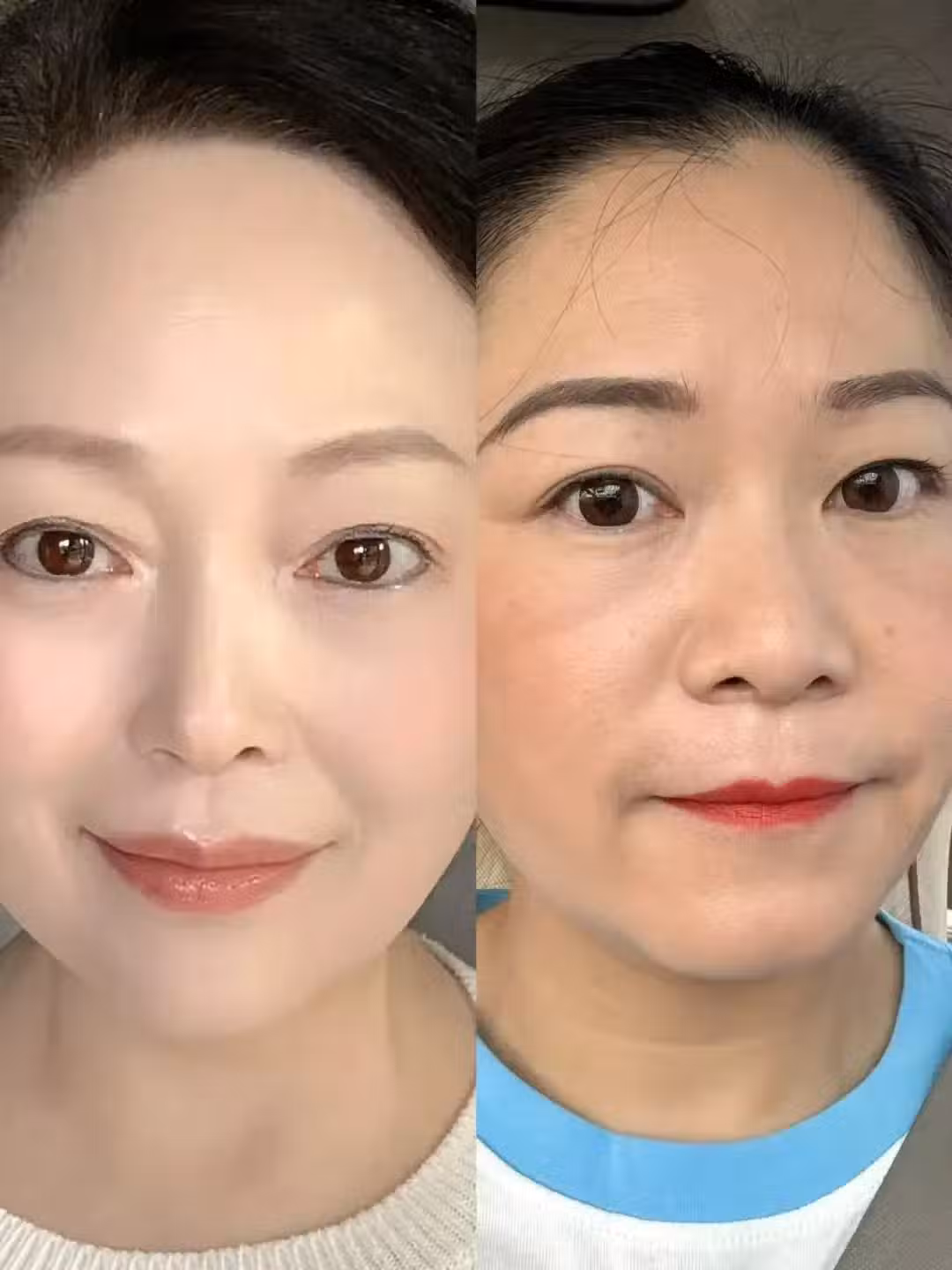 左邊這位女士妝容自然和簡潔,看起來乾淨清爽,而右邊女性的妝容整體上其實並不和諧,尤其是眉毛和唇妝過於濃重,底妝也並不服帖,並不適合自然場合妝容。