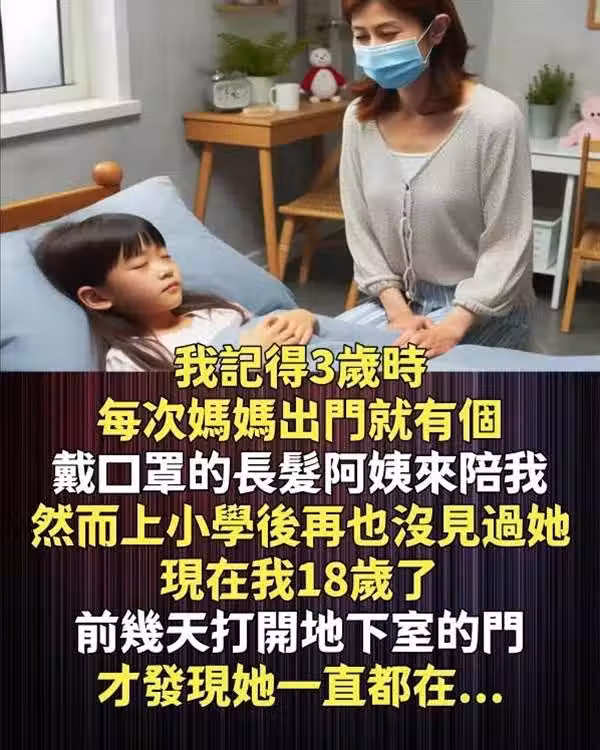 我記得3歲時,每次媽媽出門,就有個「戴口罩的長髮阿姨」來陪我,然而上小學後再也沒見過她!現在我18歲了,前幾天「打開地下室的門」,才發現她一直都在!