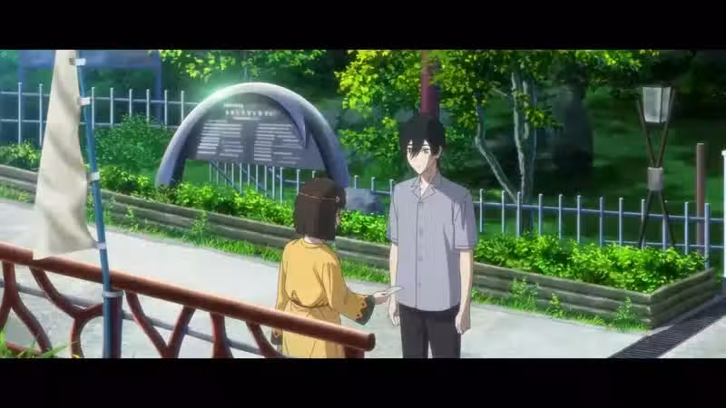 在上面這一幕當中,兩位主角出現在了岐阜市的知名觀光景點岐阜公園,而背景出現了一個形狀奇特的紀念碑。