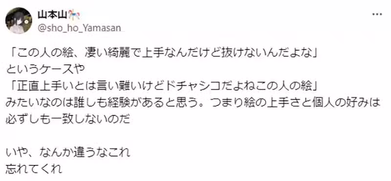 這位暱稱「山本山」的日本X網友,最近提起了宅宅們在評論插畫或是漫畫作品好不好的時候,常常會依照「畫功」和「實用性」這兩種不同角度切入的話題。