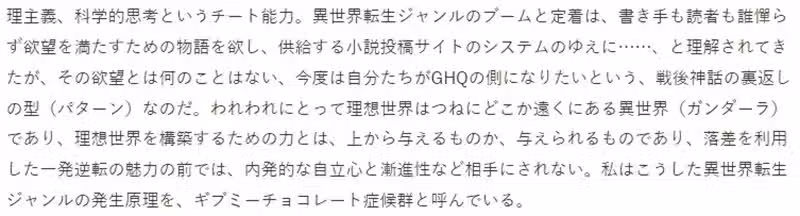 以上市川沙央分析異世界轉生作品在日本興盛的書評,隨即引發了日本網友們的激烈論戰。許多網友贊同她的說法,認為日本人就是想要從異世界轉生作品當中,填補個人內心與國族認同的自卑感。但也有不少反對派的網友認為,她的分析太過穿鑿附會。看異世界轉生作品就是想要看爽而已,哪有什麼深奧的歷史淵源啊!