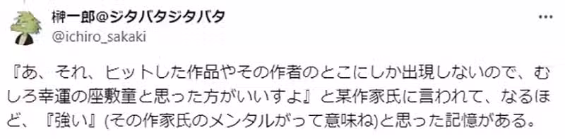 當時有位作家朋友就勸榊一郎,應該把這種人當成帶來幸運的「座敷童子」。畢竟要是作品不夠紅,還不會碰上這種人呢!