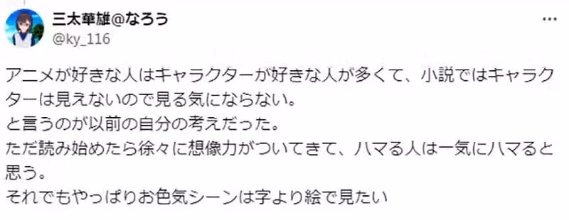 「因為影像和音樂可以放著給他播,自己純粹當個被動的觀賞者就好。小說卻需要主動去閱讀才可以,而大腦的處理能力又因人而異啊。」