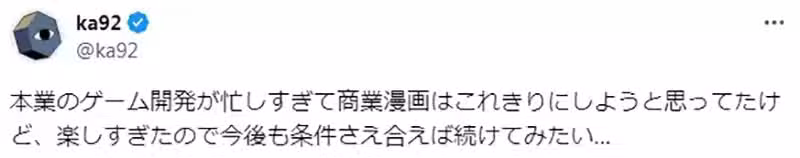「我非常有想要全心全意投入畫漫畫的念頭,不過這間公司是我從小就一直想要進的公司,而且本業也讓我很有成就感,所以我還在苦惱就是了……」(2023年7月22日發文)