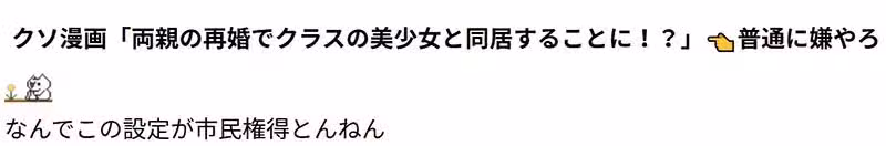 日本「5ch」討論區最近區出現了這篇討論串,發文網友批評起了「父母再婚導致突然跟班上的美少女同居」這類動漫作品當中常見的劇情,引發熱烈反響!