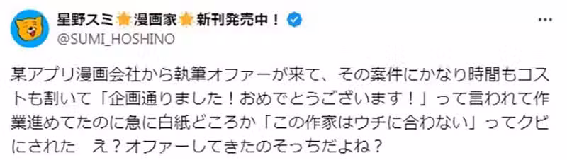 日本漫畫家星野スミ,最近發文抱怨某個漫畫APP發了委託案給他,後來卻出爾反爾,說取消就取消,讓他白白投入許多成本的事情……