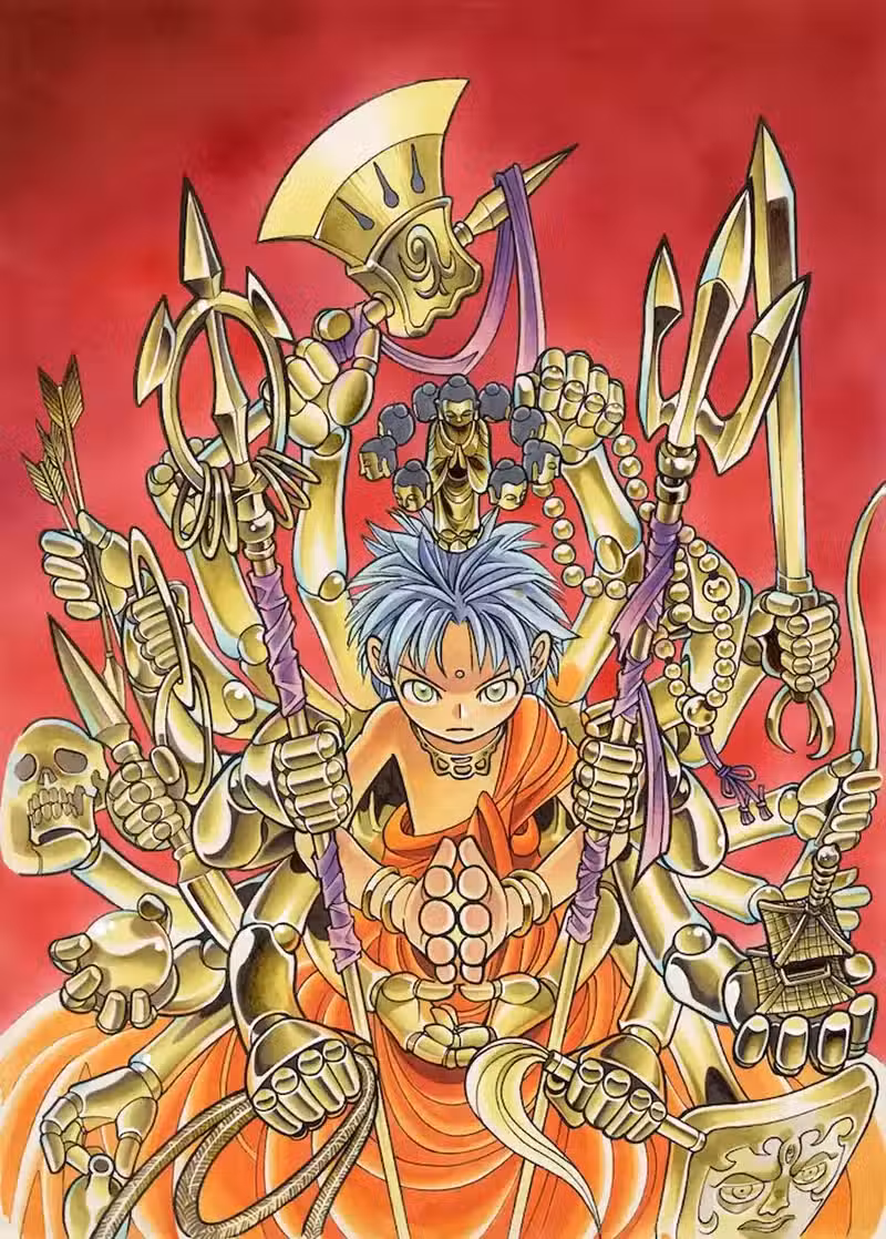 本作的故事敘述女主角沙琪從小居住的寺廟「西岸寺」,面臨被地方上的角頭強制拆除的命運,想不到1997年當時作者就以都更為靈感創作(誤),總之在千鈞一髮之際,佛堂里的千手觀音像動了起來,除了主動擊退了拆除寺廟的幫派份子外,還從碎裂的神像中蹦出一位自稱千手觀音的少年,名字就叫「千手」,並且表示自己遵從「大日如來」所交付的任務,要護送釋迦摩尼的轉世者前往印度,協助對方悟道成為救世主「彌勒」的故事