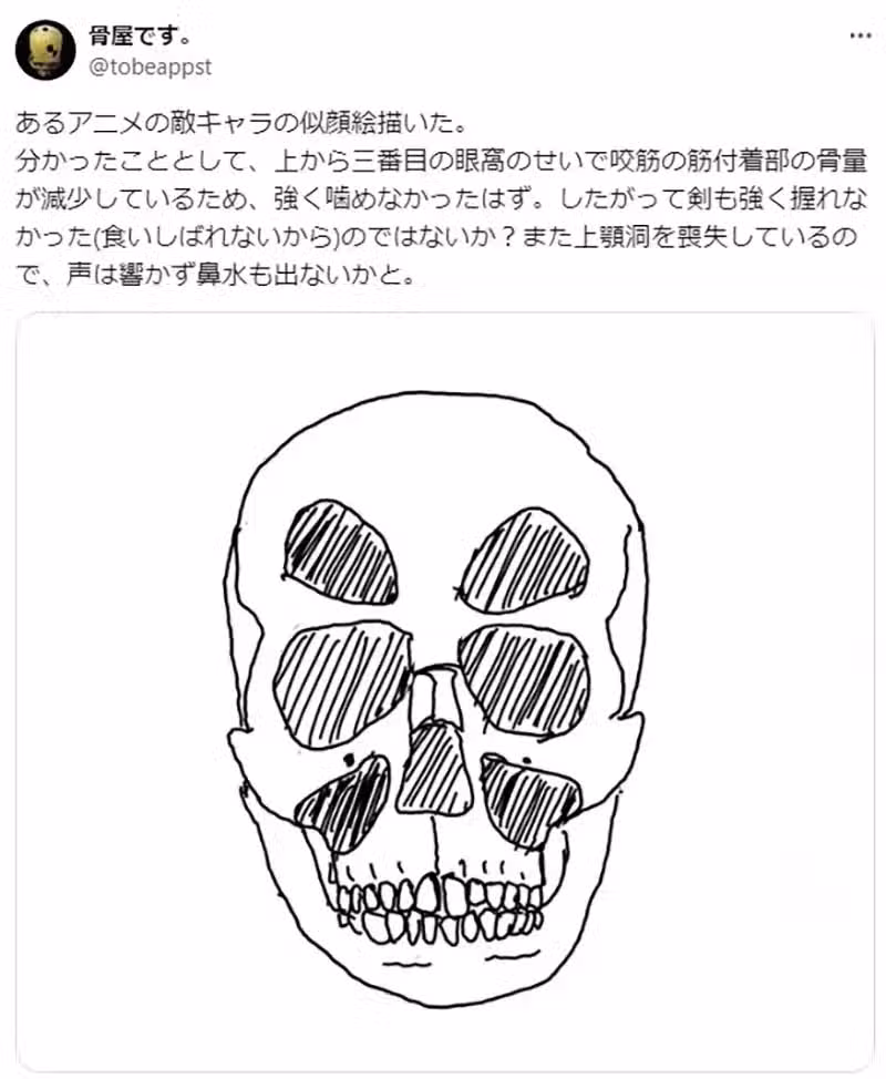 一位暱稱「骨屋です」,自稱是鑽研人類學與病理學的日本網友,最近發表了一系列的文章,分析從某部動畫作品的反派角色的臉部骨骼,就可以看出這個人的身體可能帶有的各種健康問題。