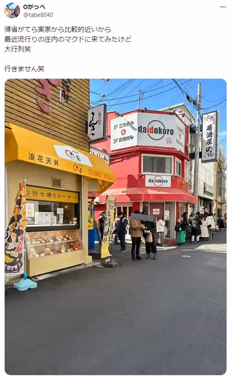 「聽說莊內站前的麥當勞成為了世界級的觀光地,所以我也來湊熱鬧。結果還真的像是世界級觀光地一樣,排隊排得有夠誇張。最後我去吃了對面的咖喱飯了。」
