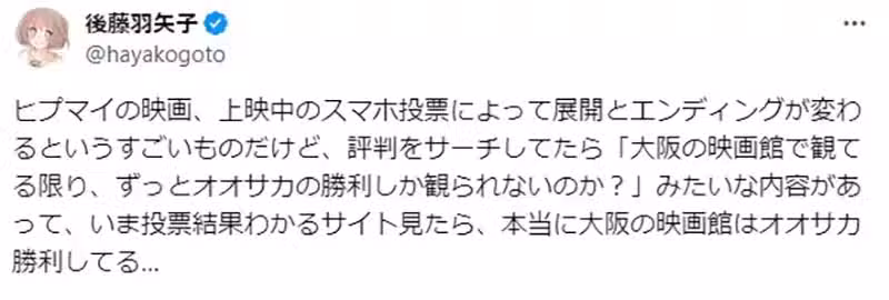 後藤羽矢子就這番話隨即引爆大量網友議論。因為劇中每一隊都具有很強的地區色彩,所以不少網友就認為這算是一種「主場優勢」。這種主場優勢雖然對於鞏固票房而言非常有用,然而對於想要多看不同劇情走向的觀眾來說,就成了很大的阻礙了……
