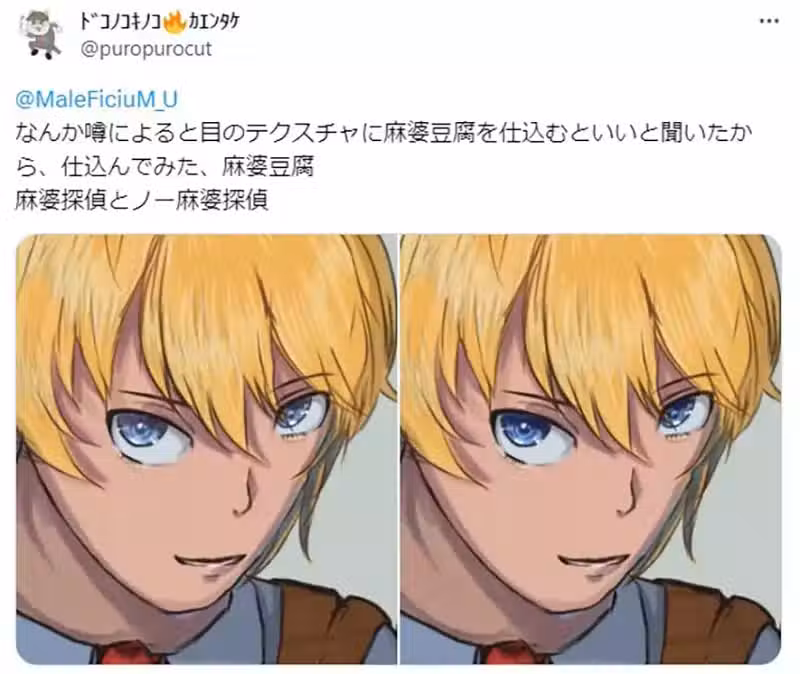 「我滑到『在角色眼中貼麻婆豆腐紋理』這個神秘的技巧,所以也來試試看了。用覆蓋效果好像不錯耶?有點有趣。」
