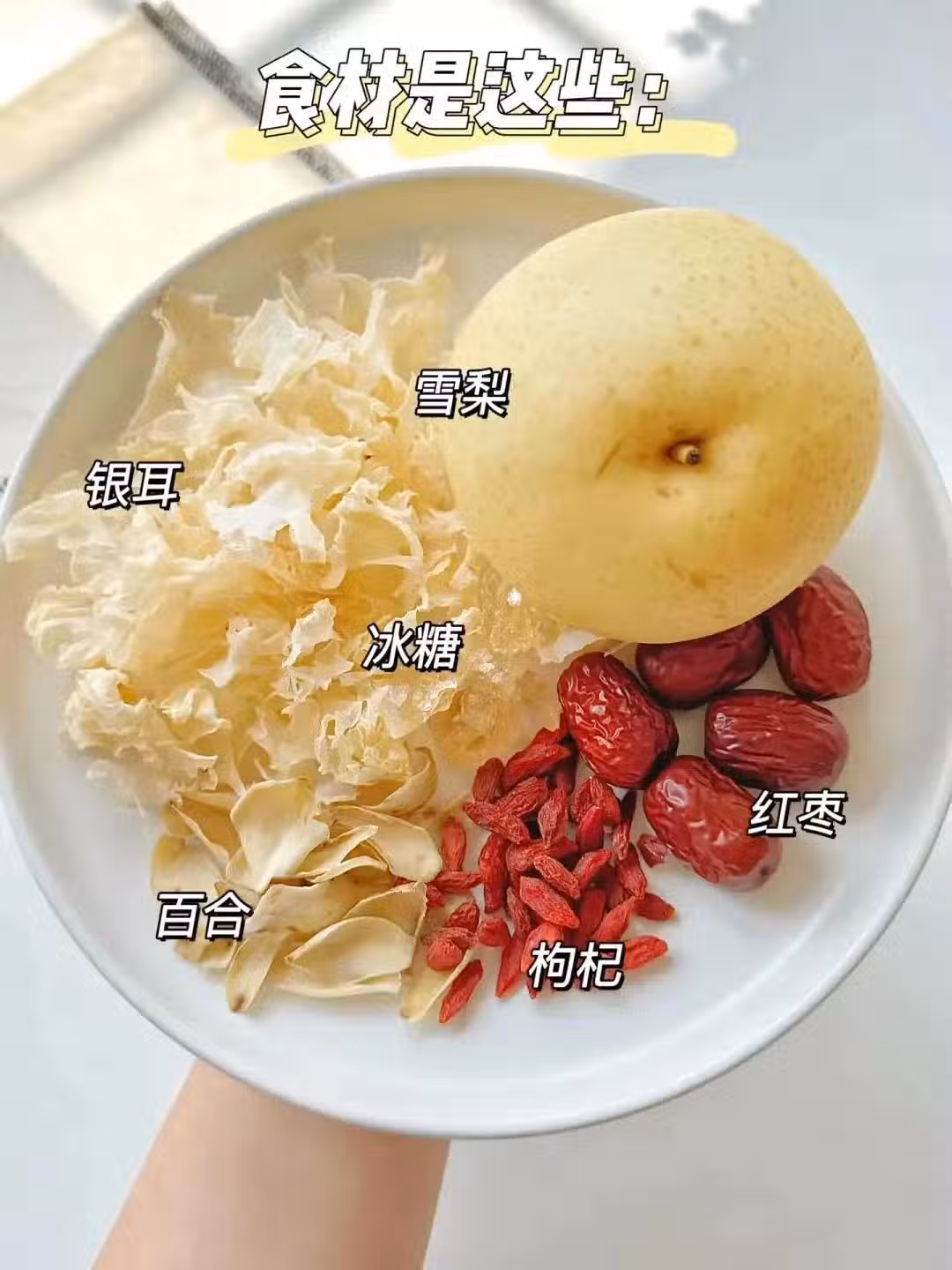 雪梨1個,銀耳20g,百合20g,冰糖30g,紅棗4-8顆,枸杞適量