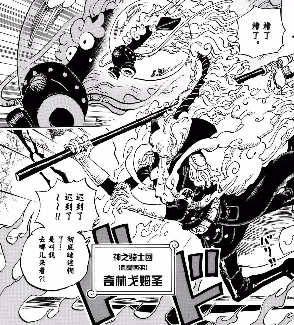 登場人物:里莫西弗·麒麟戈姆聖,神之騎士團成員,外形是一隻麒麟,身上環繞著白色飄帶,推測是動物系能力者。能力是催眠對手,武器是一把三叉戟,性格逗比,經常不自覺的睡著,可能是果實帶來的副作用。