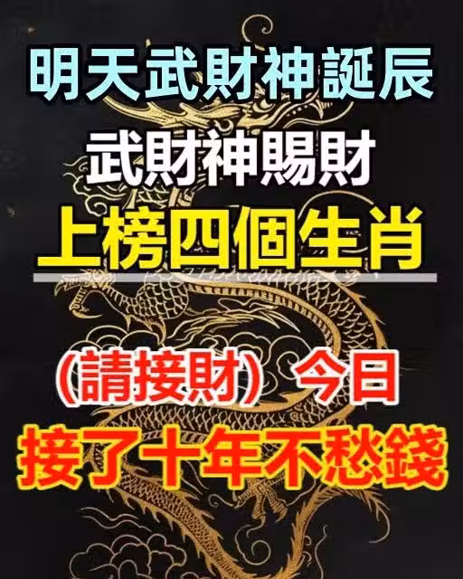 明天武財神誕辰, 武財神賜財!上榜四個生肖(請接財)今日接了十年不愁錢!