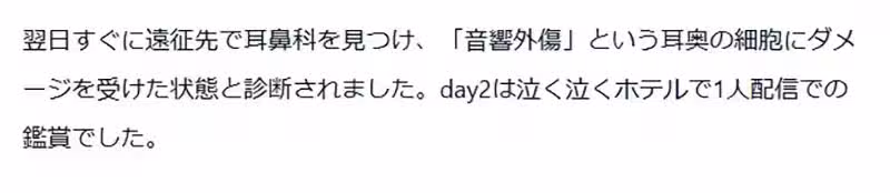 「回家以後,我又去了在地的耳鼻喉科追蹤狀況⋯⋯雖然聽力數據還在正常範圍內(高音區有輕度障礙疑慮),但是左右耳的聽力仍有落差,右耳的堵塞感、失真、雙耳耳鳴至今仍未消失⋯⋯寫這篇文章的時候,已經是發生一個半月之後了,但是情況依然沒有改善。這些症狀讓我每天都很痛苦,尤其是耳鳴和左右聽力不對稱的問題,讓我完全無法正常生活。如果沒戴耳塞,光是一般的聲音都會讓耳朵很痛,這樣的狀況反覆出現。而且還聽說耳朵深處的細胞,一旦壞死就無法再生,很有可能一輩子都不會痊癒⋯⋯」
