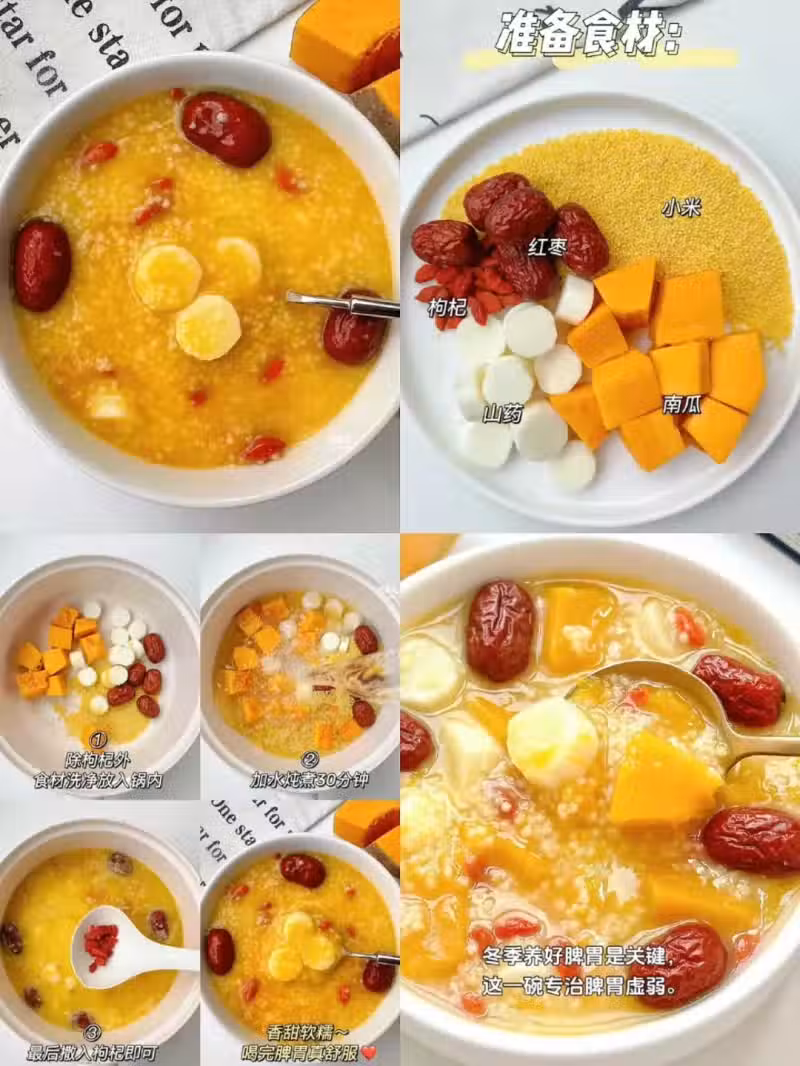 小米、南瓜、山藥均入脾經,可增強消化功能,緩解食欲不振、胃脹、胃痛,適合脾胃虛弱者。紅棗、枸杞含鐵、維生素C,可促進紅細胞生成;小米補血,適合氣血不足、貧血者。紅棗、枸杞含鐵、維生素C,可促進紅細胞生成;小米補血,適合氣血不足、貧血者。