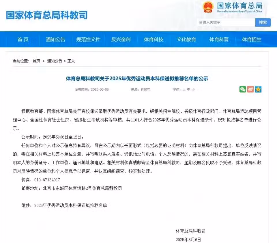 關於高校保送錄取優秀運動員有關要求,經相關招生院校、省級體育行政部門、體育總局運動項目管理中心、全國性體育社會組織、省級招生考試機構等審核,共1101人符合2025年優秀運動員本科保送條件,現對擬推薦名單進行公示。