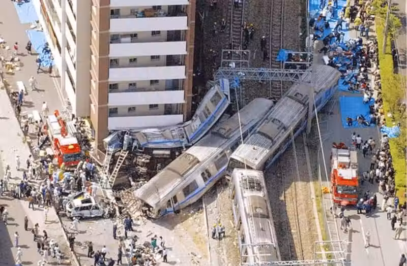 事故發生當天,一列編號5418M的列車在駛入彎道時,以遠超過限速70公里的時速116公里狂飆,導致前5節車廂脫離軌道,其中2節車廂更是直接衝撞附近的公寓建築。這起慘劇的背後原因相當複雜,涉及人為與制度問題。當時那名僅有11個月資歷的駕駛員,在事故前已因誤停月台而受到處分,加上公司實施嚴厲的「日勤教育」懲戒制度,讓他承受極大心理壓力,為了不讓列車誤點他選擇冒險超速。