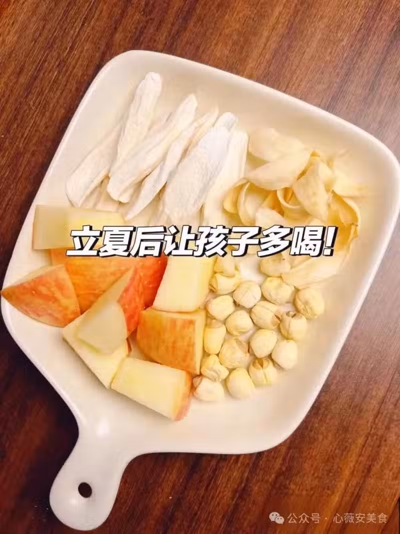 夏天老是待在空調房裡,孩子很容易外冷內熱。白天不想喝水,晚上睡覺出好多汗,大便乾得像羊屎蛋一樣,一咳嗽嗓子還又干又啞,這是身體里有燥火,把津液都傷著了。百合和蓮子堪稱「潤肺黃金組合」,專門用來滅掉燥火、止住口乾。蘋果可以補充水分、滋潤腸道,再搭配上性質平和的懷山藥,既能降火又不會傷到孩子的胃。喝了這個,孩子一整晚都能睡得踏踏實實,早上起來嘴巴也不會臭臭的。