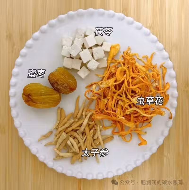 蟲草花15g、太子參8g、茯苓10g、蜜棗2顆、瘦肉400g