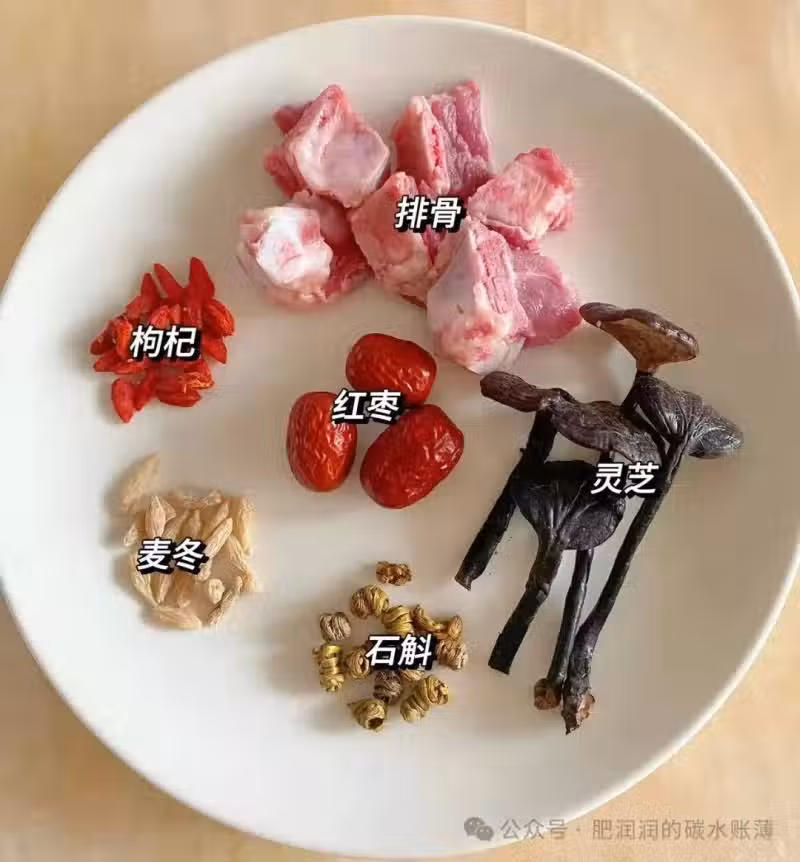 食材:排骨400g、靈芝10g、石斛10g、麥冬10g、枸杞5g、紅棗3顆