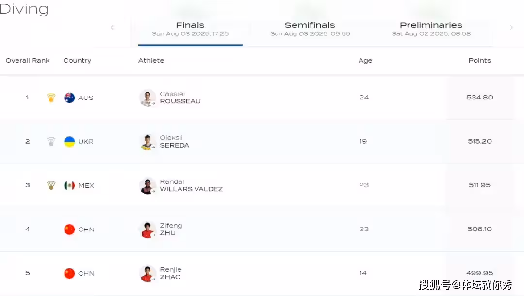 年輕的小將趙仁傑最後2跳也沒有太突出的表現,最終以499.95分的成績排名第5位,首次參加世錦賽就能獲得第5的位置,對於14歲的趙仁傑來說,還有很大的提升空間!