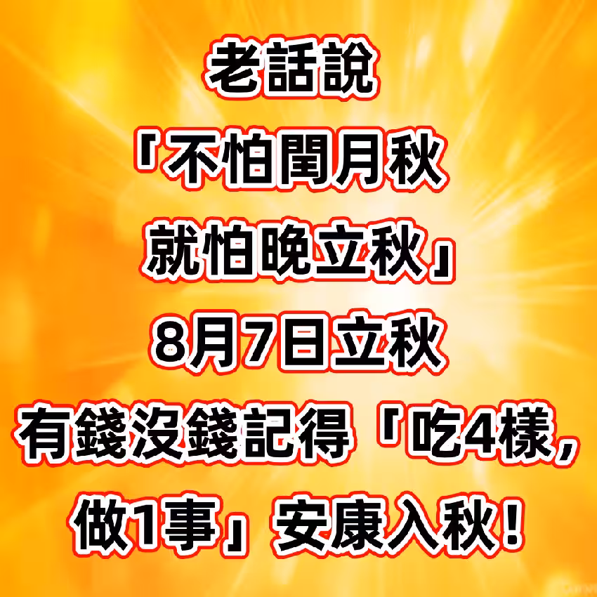 2025年的立秋,落在農曆潤六月初四,不僅是百年難得一遇的「閏六月」,還是「晚立秋」的年份,俗稱「涼來得慢、變化來得快」,不只氣候轉折大、磁場也容易動盪,對財運、健康、心情都有影響。