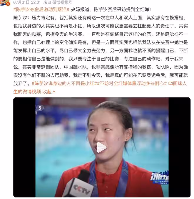 周繼紅哭了,陳若琳哭了,全紅嬋再獲至高榮耀,陳芋汐自愧不如!