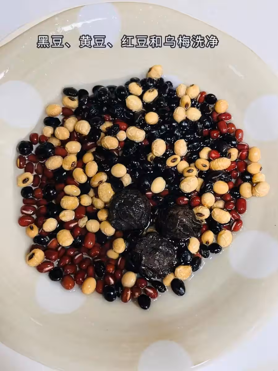 黑豆、黃豆、紅豆各30克,烏梅3顆,全部洗凈放進養生壺裡,加水煮15分鐘就夠了。