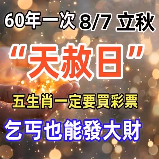 這可是2025年最強轉運日之一!立秋是秋天的開端,象徵收穫、聚財;而天赦日則是老天爺特許的「赦免日」,壞運清零,好運加倍!這一天買張彩票、求財轉運,真的是再合適不過了!有5個生肖特別容易「一夜暴富」,就算現在身無分文,也有機會逆天改命、乞丐變富翁!