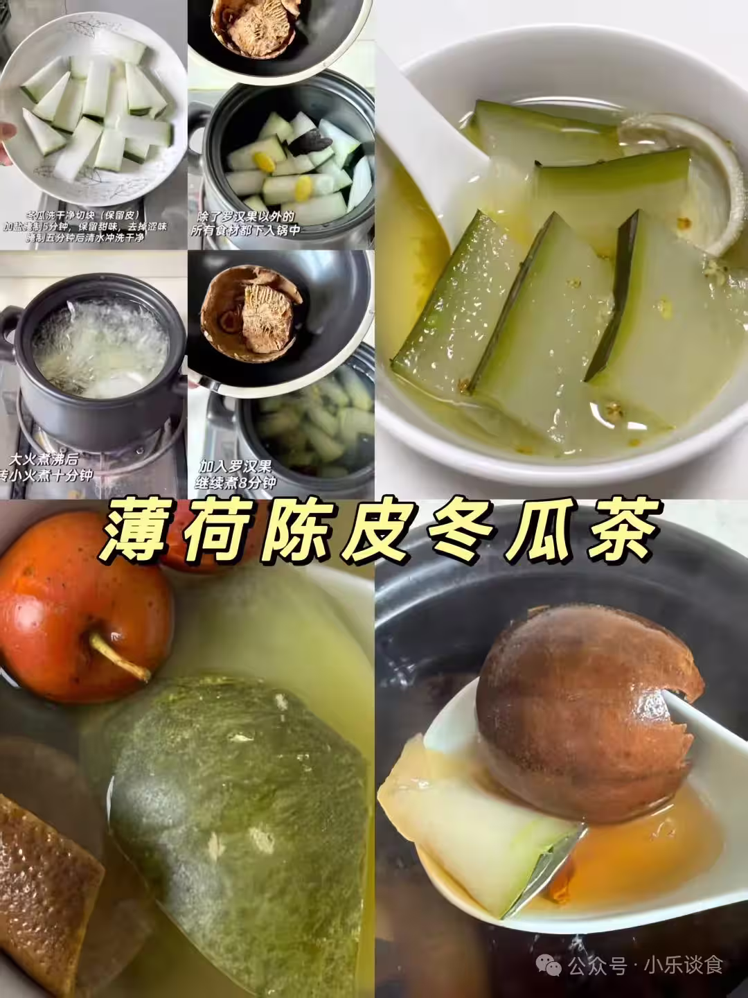 冬瓜帶皮切塊,焯水去澀味;陳皮、薄荷、冬瓜先下鍋煮,大火煮沸轉小火,最後加羅漢果再煮幾分鐘即可,清涼解暑🌬️