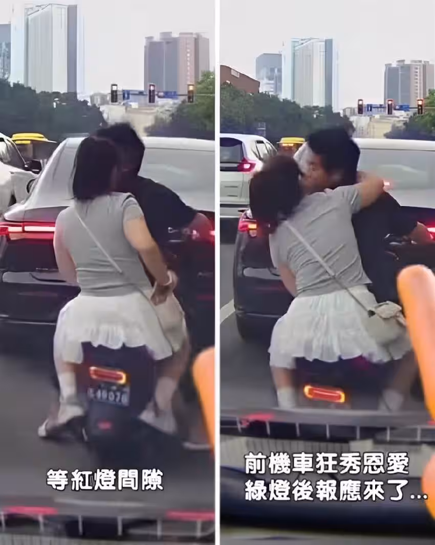 視訊中,一對情侶騎著摩托車停在路上肆無忌憚地秀恩愛,把周圍的司機尷尬得不行。