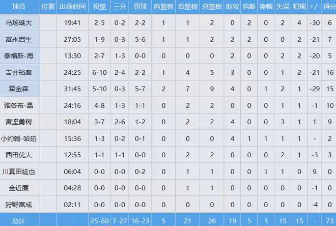 今年的亞洲杯征程,日本全部戰績為99-68敘利亞、70-78伊朗、102-63關島和73-97黎巴嫩。