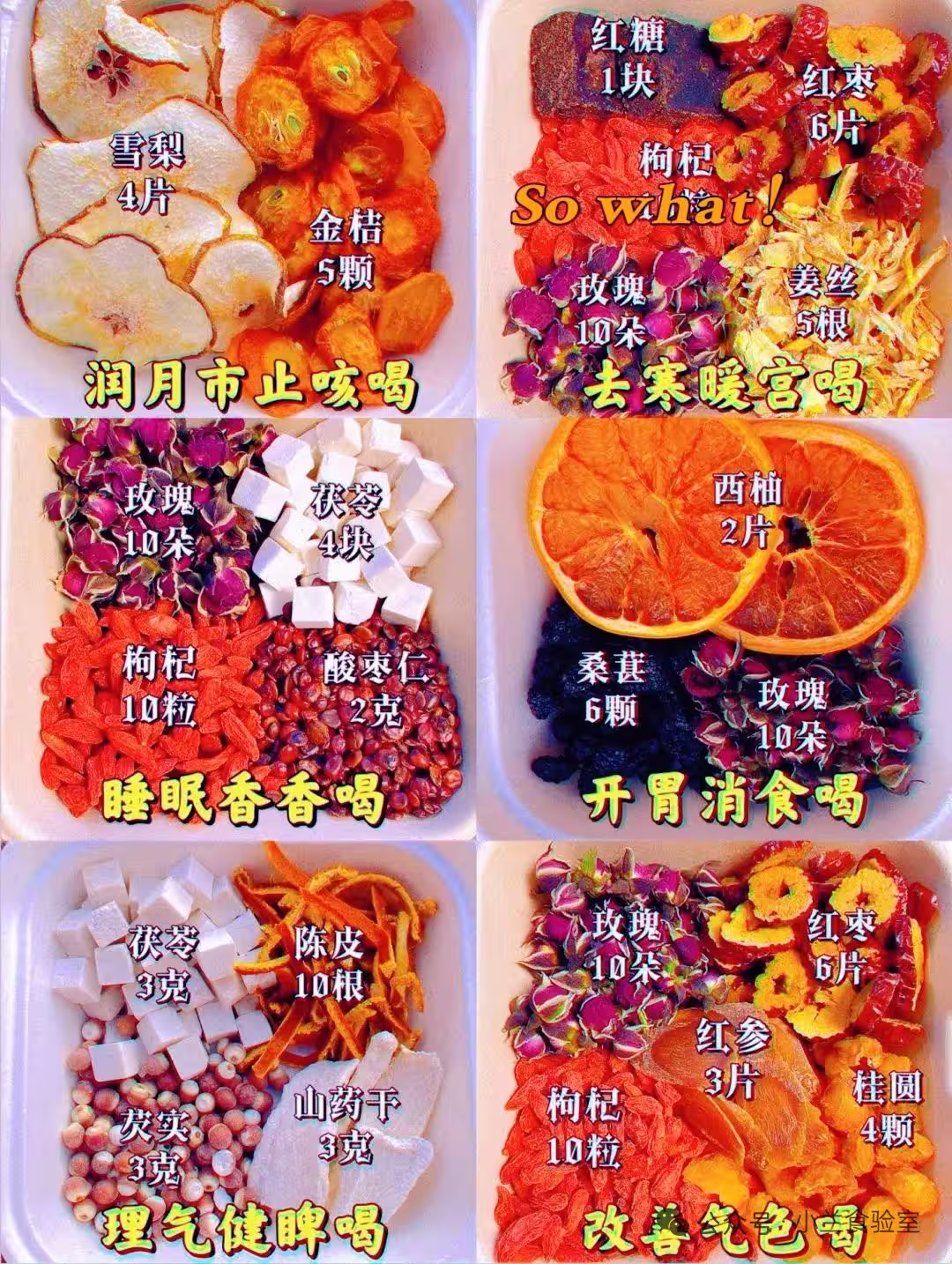 配方:紅糖8g、紅棗干6g(約6片)、枸杞5g(約10粒)、重瓣紅玫瑰3g(約10朵)、薑絲2g(約5根)