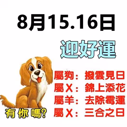 8月15日是生肖狗與太歲的六合之日,六合之日的到來,會有大貴人出現在屬狗的朋友身邊,籠罩在生肖狗的朋友頭上的霧霾瞬間消失殆盡,陽光普照,生肖狗的朋友所有的事情都會有一個快速的向前發展,瞬間生肖狗朋友心中燃起了對未來美好生活的嚮往。