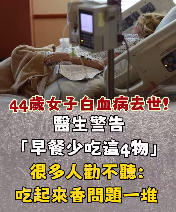 44歲女子白血病去世!醫生警告「早餐少吃這4物」很多人勸不聽:吃起來香問題一堆!