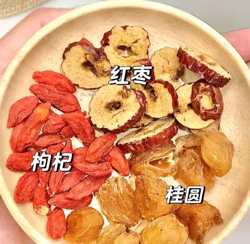 桂圓安心補血,枸杞滋養肝腎明目,紅棗健脾養血。