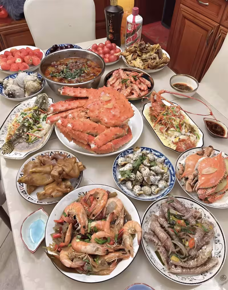 生日當天,我從早忙到晚。 螃蟹現殺現蒸,蝦線一根根挑凈,龍蝦擺成精美的造型。