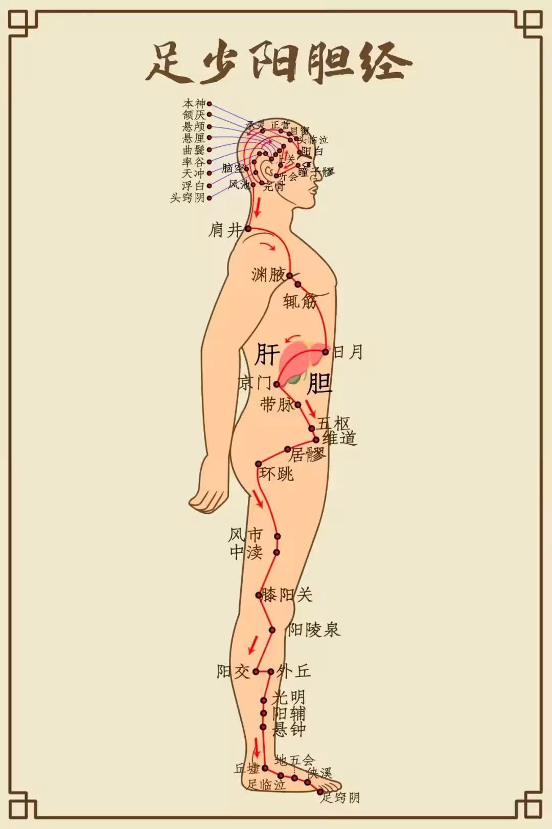 膽經又叫足少陽膽經,共44穴,左右合88穴。提示你站起來,手指尖順著側面褲縫到膝蓋那一條線,其實主要就是敲環跳、風市、中瀆、膝陽關四個穴位。