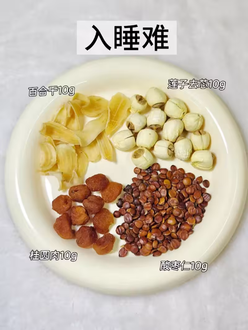 1、準備酸棗仁10g➕百合干10g➕蓮子10g➕桂圓肉5顆