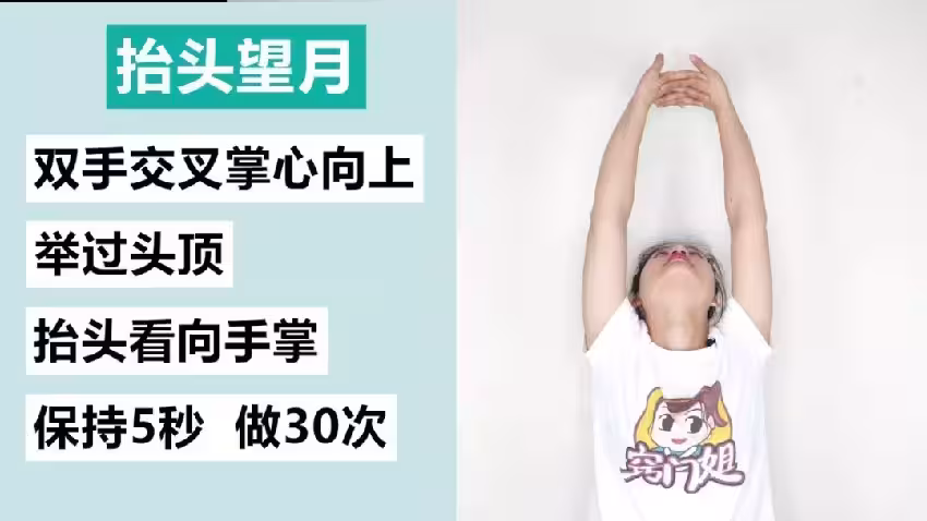 雙手交叉掌心向上,舉過頭頂,抬頭看向手掌,保持5秒做30次
